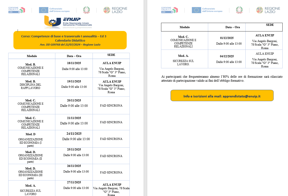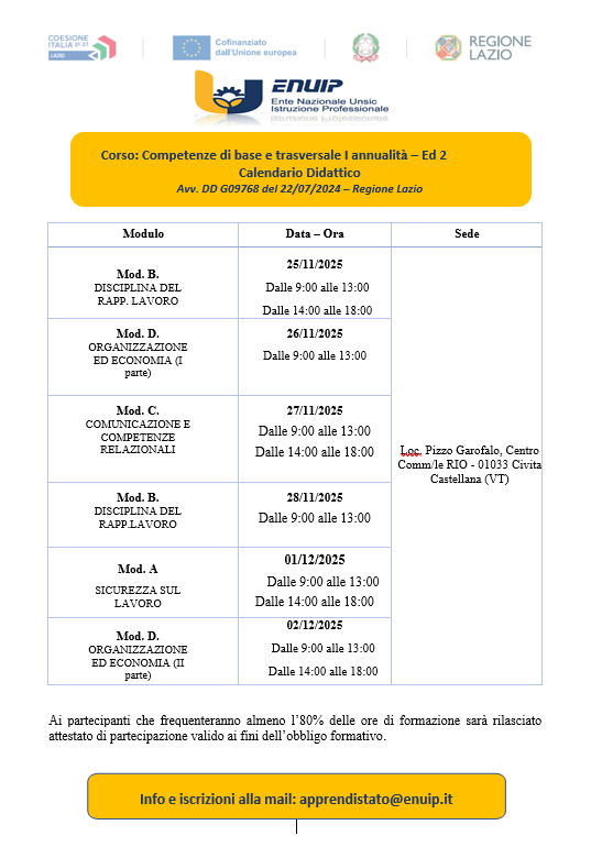 Enuip è accreditato presso la Regione Lazio per l’erogazione della formazione di base e trasversale e garantisce all’azienda il totale e completo svolgimento delle pratiche relative alla definizione, organizzazione, erogazione della formazione professionalizzante degli apprendisti