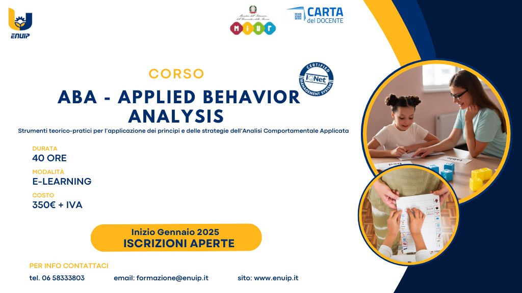 Il corso di formazione ABA – Applied Behaviour Analysis (Analisi Applicata del comportamento) riconosciuto dal MIM (ex MIUR) mira a fornire strumenti teorico-pratici per l’applicazione dei principi e delle strategie dell’Analisi Comportamentale Applicata. In partenza da MARZO 2025 A chi è rivolto? Insegnanti, assistenti socio-sanitari, personale scolastico, genitori e professionisti nel settore riabilitativo come pedagogisti,...Read More
